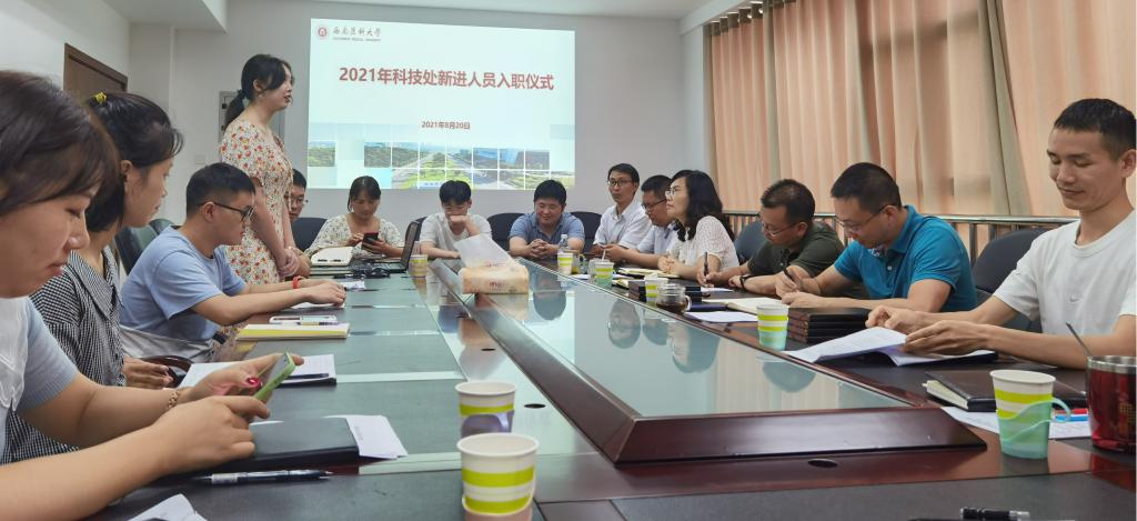 为了增加新员工的归属感、荣誉感,增强部门凝聚力,2021年8月20日,科技处在德诚楼812会议室举行新员工集体入职仪式,仪式由科技处副处长唐雁主持,科技处处长周翔宇、副处长万居易、许望东及全体职工参加。