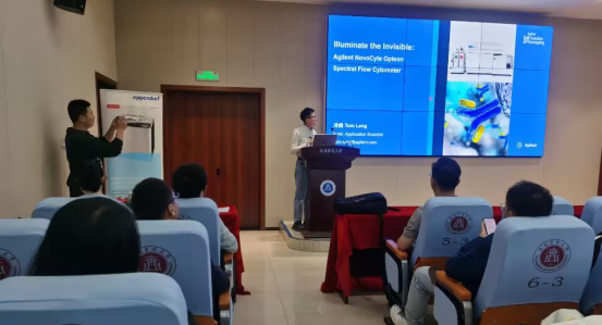 为强化学习效果,培训设置了上机操作环节。学员在工程师指导下,亲手操作Agilent NovoCyte Opteon全光谱流式细胞仪,完成样本制备、数据采集及分析全流程,直观感受技术的高效性与精准性。此外,冷良工程师结合肿瘤微环境研究、免疫治疗监测等实际案例,展示了全光谱流式在解决复杂生物学问题中的独特价值,引发热烈讨论。