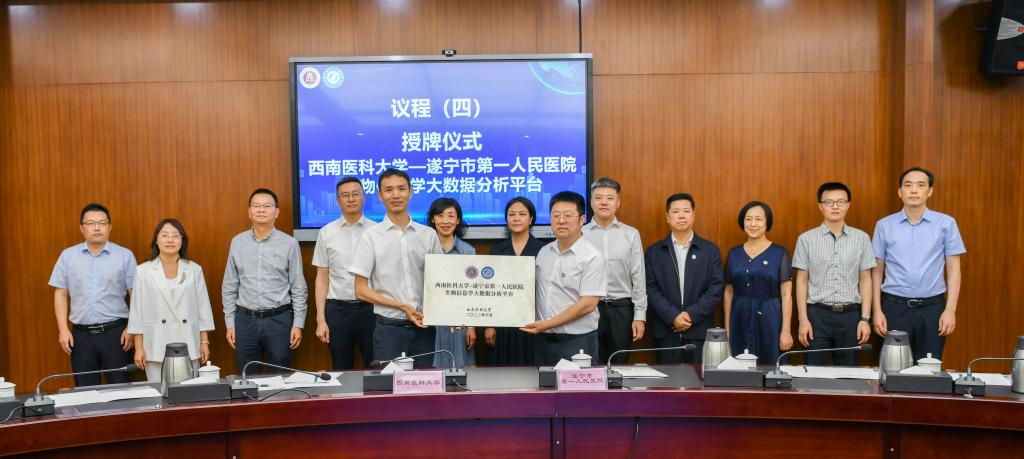 会上举行了遂宁市第一人民医院-beats365官方网站战略合作协议续签仪式,随后我校为遂宁市第一人民医院进行了“beats365官方网站实践基地”和“生物信息数据平台”授牌仪式,侯勇和何涛代表双方单位互赠纪念品。在座谈环节,双方就医疗管理、科研、护理管理、财务运营管理等方面合作细节展开交流,达成初步共识。