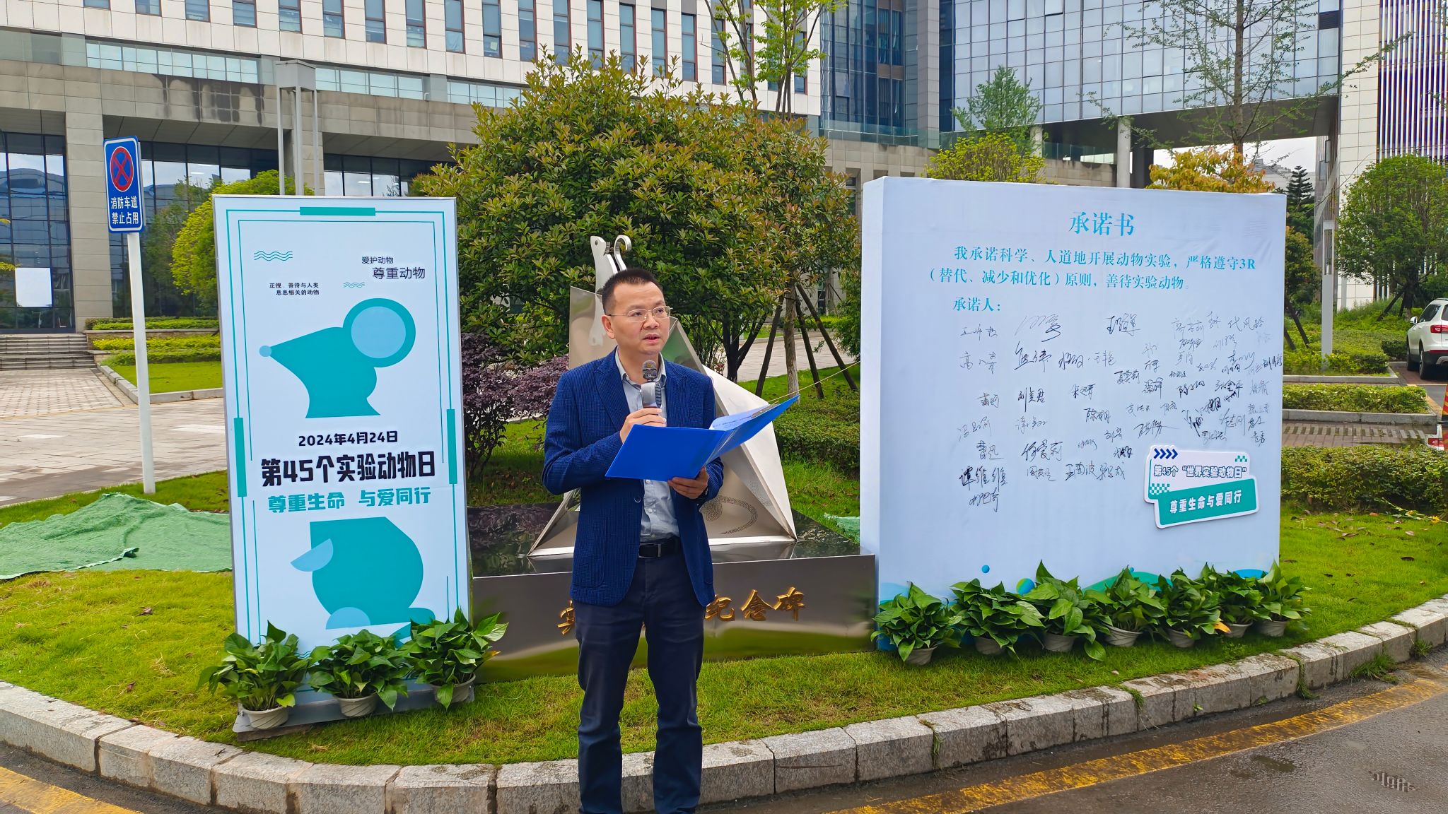 2024年4月24日,科技处全体职工在实验动物纪念碑前举行了第45个“世界实验动物日”纪念活动。此次活动以“尊重生命,与爱同行”为主题,旨在肯定实验动物在生命科学研究中的重要贡献,呼吁全校师生进一步提升对实验动物福利与伦理的重视。科技处处长周翔宇、副处长许望东、王路军,教师和学生代表共计50余人参加了纪念活动,活动由许望东主持。