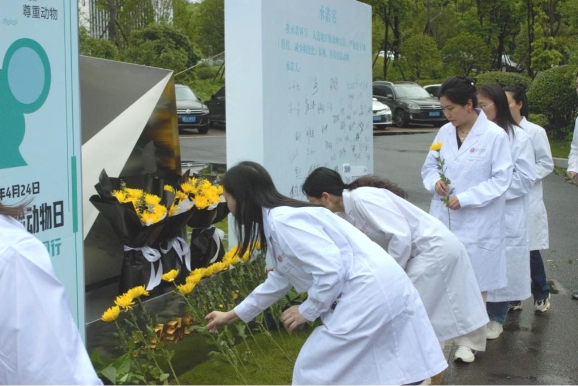致辞结束后,全体与会人员集体默哀三分钟,向纪念碑献花并鞠躬,以缅怀为人类科研事业献出生命的实验动物。