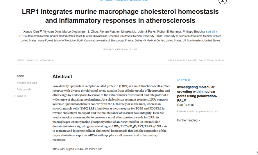 11月16日,由我校心血管医学研究所与美国德州大学合作完成的最新科研成果,以心血管医学研究所丁银元博士为并列第一作者的论文《LRP1 integrates murine macrophage cholesterol homeostasis and inflammatory responses in atherosclerosis》在国际著名期刊《eLife》(SCI IF 7.725)线上发表。这是2017年继心血管医学研究所李光副教授在知名杂志《PNAS》(IF=9.42)、曹济民教授团队在《Scientific Reports》( IF=5.22)、党喜同教授团队在《Scientific Reports》发表高水平论文后取得的又一可喜成果。