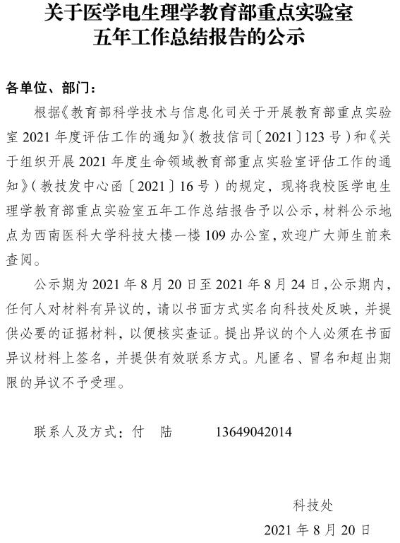 关于医学电生理学教育部重点实验室五年工作总结报告的公示