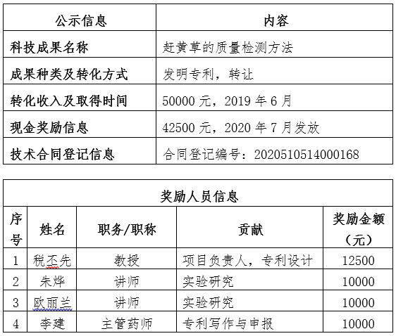 根据《财政部 税务总局 科技部关于科技人员取得职务科技成果转化现金奖励有关个人所得税政策的通知》(财税〔2018〕58号)、《科技部财政部税务总局关于科技人员取得职务科技成果转化现金奖励信息公示办法的通知》(国科发政〔2018〕103号)以及《beats365官方网站科技成果管理办法》(西南医大科〔2018〕1号)等文件有关规定,现对《赶黄草的质量检测方法》科技成果转化现金奖励分配方案进行公示。公示期20天,自2020年6月1日至2020年6月20日。如有任何异议,请于公示期内向科技处书面实名提出并提供相应的证明材料。