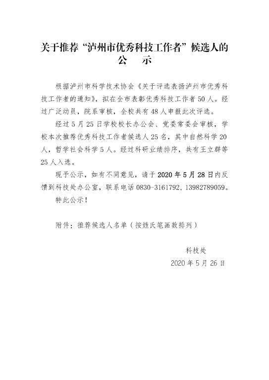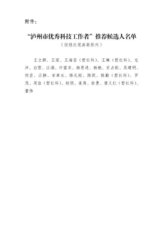 关于推荐“泸州市优秀科技工作者”候选人的公示